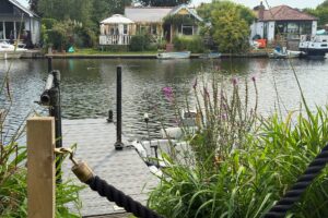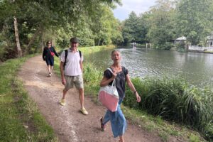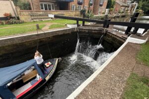 The route then joins the Wey Navigation, offering a change of scene as the wide river gives way to canal-side walking. Here we pass a beautifully preserved lock keeper’s cottage, old red-brick warehouses, and sweeping gardens of very grand houses that line the water’s edge. It’s an easygoing four-hour walk, with time to pause for photos, snacks, and hopefully a swim.
