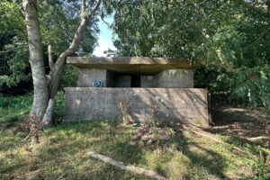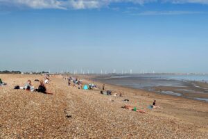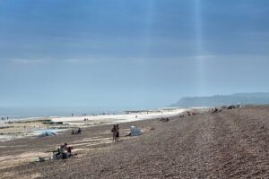 Then onwards and upward to Hogs Hill for our packed lunches with glorious views out to sea with fields of wind turbines and our destination of Winchelsea Beach. We sat in front of an old military pill box, reminding us of the menacing position this idyll vista offers.